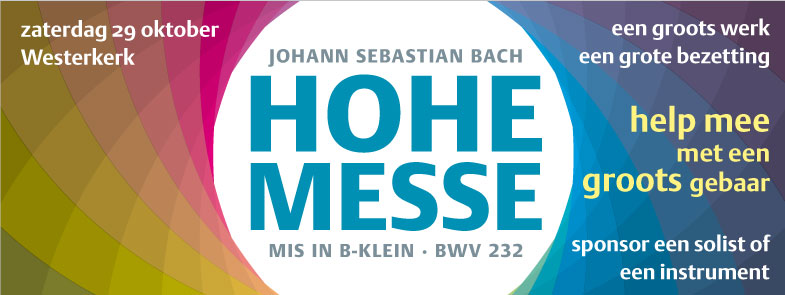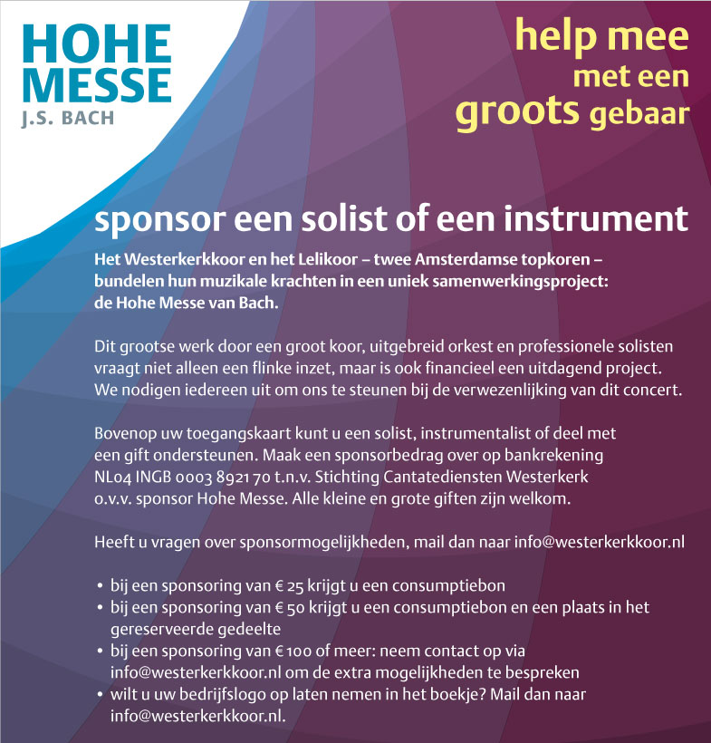 Bovenop uw toegangskaart kunt u een solist, instrumentalist of deel met een gift ondersteunen. Maak een sponsorbedrag over op bankrekening NL04 INGB 0003 8921 70 t.n.v. Stichting Cantatediensten Westerkerk o.v.v. sponsor Hohe Messe. Alle kleine en grote giften zijn welkom.